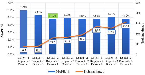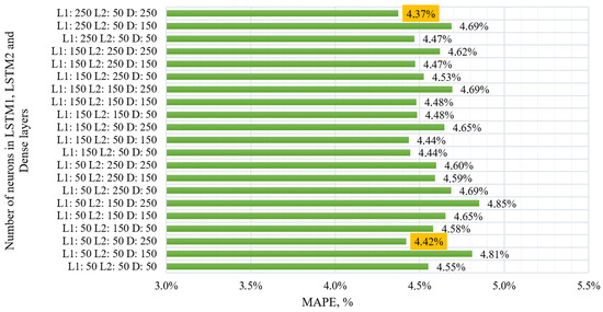The choice of the model configuration is based on the grid search method, which is used to determine the optimal number of neurons in the LSTM and Dense layers of the neural network [40,41,42]. In accordance with this method of model training, an algorithm for the cyclic enumeration of all possible combinations of hyperparameters is implemented. To enumerate various combinations in each layer, a list of neurons for each of the three layers of the model (two LSTM layers and one Dense layer) with values of 50, 150, and 250 was formed. In the conducted study, 21 models were trained with a total time cost of 110,019 s (30.6 h). During the study, it was noted that an increase in the number of neurons in the first and second LSTM layers leads to a significant increase in the model training time. However, no corresponding improvement in the quality of the model forecasts is observed. This confirms the assumption that the complexity of the model does not always correlate with its performance. In connection with the above observations, it was decided that the cyclic enumeration of parameters would be stopped after reaching the specified configuration. Figure 10 shows the distribution diagram of the MAPE forecast error indicator when changing neurons in the two LSTM layers and one Dense layer model.