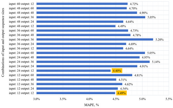 The length of the history sequence refers to the number of previous time steps that the model uses for training and subsequently for predicting the target variable. If the history depth is too small, the model may not have enough information to identify important time patterns; otherwise, training the model may become complex and expensive in terms of computational time. The conducted experiment to find the optimal ratio of history length and forecast horizon took 95,257 s over 20 epochs of model training. In this case, various combinations of input and output data were tried with an assessment of the model quality metrics. In the conducted study, 20 different sets of parameters with history [12, 24, 36, 48] and forecast [12, 24, 36, 48, 60] depths were considered. The figure shows the results of the analysis of the influence of the history depth and the forecast horizon length on the change in the MAPE metric over 20 epochs of model training. In Figure 11 shows the results of the analysis of the influence of the depth of history and the length of the forecasting horizon on the change in the MAPE metric for 20 epochs of model training.