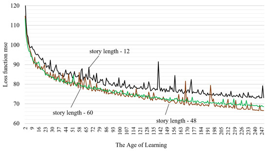 Of particular interest is the change in the loss function during the model training process. To accomplish this, the number of epochs was increased from 20 to 50 and the behavior of the mean square error was assessed for cases with 12, 24, and 60 time steps entering the LSTM model (Figure 12).