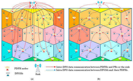 One of the main factors influencing how long a network lasts is how well a node maintains its energy. The network would fail to achieve its targeted operating needs in a shorter amount of time if its rate of energy consumption increased. The proposed protocol may make sure that PDFHs with more energy are chosen by basing the PDFH selection process on the RE of SNs. This choice criterion may increase the network’s overall stability and lengthen its duration of use. Moreover, the PDFH selection procedure can reduce energy consumption by taking the distance to the sink into account. This method guarantees that SNs closer to the sink are prioritized as PDFHs, reducing the need for energy-consuming long-distance transfers. Furthermore, another critical component in PDFH selection is the average distance between DFGMs, which is considered in the proposed protocol. In conclusion, it seems that the proposed protocol presents a viable option for network-wide energy consumption optimization. Through the consideration of node-to-node energy consumption balance, the proposed protocol might potentially prolong the life of IoT networks and lessen early PDFH death. Moreover, they select PDFH by applying the MPA to calculate the DFFF. The substantial interest in MPA within the research community can be attributed to several factors, including its simplicity, applicability, realistic runtime performance, rapid convergence rate, high effectiveness, and capability to address continuous, multi-objective, and binary optimization problems more efficiently than other established algorithms in the field. To emphasize the effectiveness of MPA, we presented its initial application within an IoT domain directly relevant to this research, along with some preliminary results [,]. A key differentiator lies in the use of distinct fitness functions: one study applied a three-dimensional fitness function [], while another used a five-dimensional fitness function []. For the proposed protocol without routing, following the PDFH selection process, SNs send their data to their selected PDFH, which aggregates the received data with its own data and then transmits it directly to the sink node, as shown in Figure 1a in the case of the proposed protocol without routing. However, in the case of the proposed protocol with multi-hop routing, PDFH sends the data to PR based on the RDFCF, as demonstrated in Figure 1b. This section provides a comprehensive overview of the algorithms considered to enhance the performance of the proposed protocol. Specifically, Section 5.1 elucidates the method for dividing the network area, while Section 5.2 offers an in-depth explanation of how the MPA is used to select a PDFH, FSDFH, and SSDFH, while Section 5.3 addresses the techniques employed to avoid intra- and inter-DFG interference. In Section 5.4, data transmission using multi-hop routing and innovative RDFCF is demonstrated thoroughly. The communication overhead is presented in Section 5.5. Finally, Section 5.6 deals with the major network impairments.