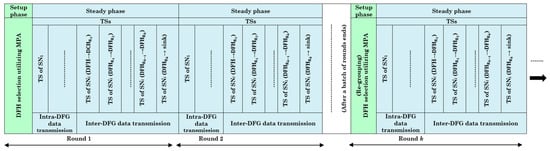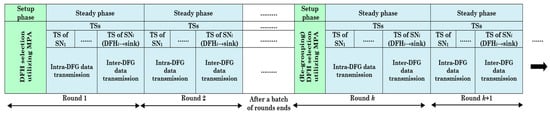 In the proposed protocol, SNs are randomly distributed inside a W × W rectangle sensing field. Each SN has a distinct ID that can be anywhere between 1 and N, such that SN = {SN1, SN2, …, SNN}. Along with its coordinates in relation to the field center, it also contains location information (). The network model’s graphic representation is displayed in Figure 1. Data from SNs are received by a DFH, and are subsequently routed to the sink node, where the sink node is positioned at a specific location outside the region. The network is broken down into rounds throughout its active lifespan. Setup and steady-state are the two phases that jointly make up the first round. The steady-state phase is all that is included in subsequent rounds. It is noteworthy to mention that regrouping (DFH reselection) must take place after a certain number of rounds (i.e., batch), so the setup and steady-state phases are carried out in the following round. However, successive rounds only comprise the steady-state phase, and the process continues, as confirmed in []. The RTs for the proposed protocol are given in Figure 2 and Figure 3, respectively, to ensure the efficiency of the data fusion mechanism. In the setup phase, the sink node employs the MPA to identify DFHs after dividing the sensing area into DFGs. This will be covered in more depth subsequently. In the setup phase, all SNs in the area of sensing receive a request information message from the sink node, and each SNi responds by sending an information message to the sink node. The ID, current RE, and location of a SNi are all part of this message. The sink node breaks down the area of sensing into H equal hexagonal groups after receiving this message from all SNs, where the group’s radius is adaptable to the network size. Every DFG can be represented symbolically by DFGH and is identified by all SNs. Furthermore, after the MPA method is executed, the sink node gathers these data into the sink node’s table message, which contains crucial network information and is subsequently provided to SNs used to identify as a for each DFG. In addition, the sink node is liable for figuring out the relative RT and assigning each SNi a specific TDMA TS for packet transmission during the steady state phase. Consequently, it sends its data directly to DFHl. After transmission, SNi enters sleep mode to save energy. Then, a DFHl collects data from all of DFGMs and delivers them directly to the sink node or the next PDFR based on the proposed protocol without routing and with multi-hop routing, respectively.