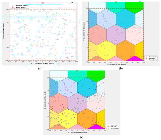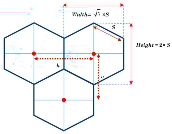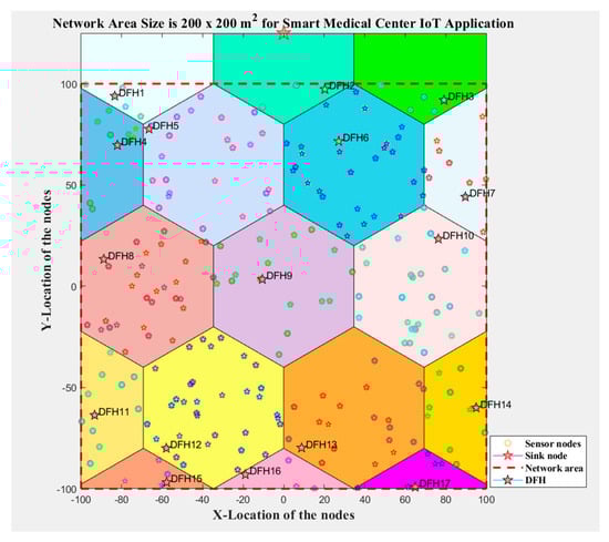 In the pointy top orientation, the vertical distance (v) between neighboring hexagonal centers is . However, the horizontal distance (h) is , as represented in Figure 4. Based on this division, Figure 5a illustrates the network before partitioning, covering an area of 200 × 200 m2. Subsequently, Figure 5b,c demonstrate the network post-partitioning and the distribution of SNs into the constructed DFG.