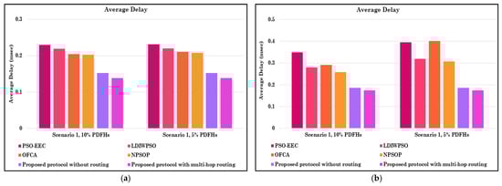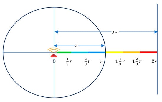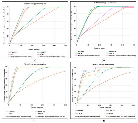 where the term Eelec, measured in nJ/bit, in Equations (14) and (15) refers to the energy consumed by the transmitter or receiver electrical circuits per bit. In the multipath fading channel model and the free space model, we utilize and , respectively, to quantify the energy consumption per bit of the amplifier. The distance between the transmitter and the receiver is indicated by d. The threshold distance, also known as the crossover distance (do), is the point of change between the two communication models previously explained. To determine the value of do, we employ the subsequent method [,]: