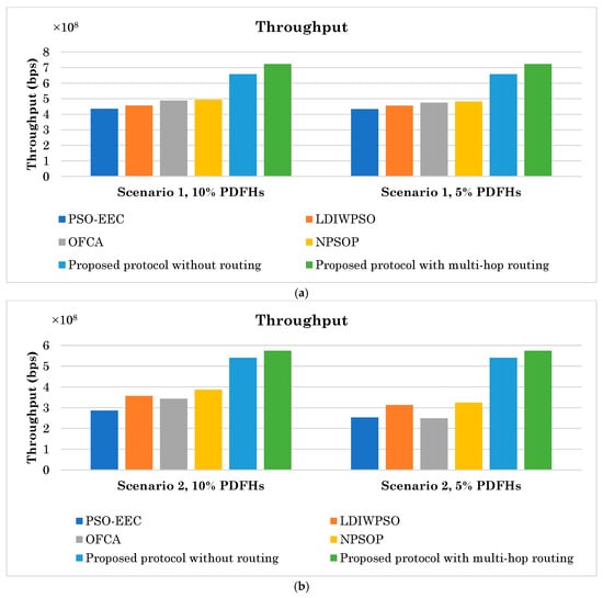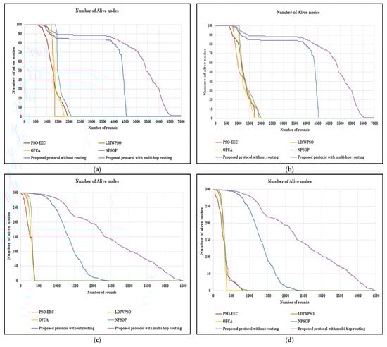 Energy and Distance-Based CH Selection (EDB-CHS) and EDB-CHS with Balanced Objective Function (EDB-CHS-BOF) are two innovative protocols for CH selection that were proposed by Darabkh et al. []. The objectives of these protocols are to prevent premature SN breakdown, handle imbalances in energy consumption among SNs, and increase the lifespan of the network as a whole. They suggest a hexagonal cluster structure for the EDB-CHS protocol and generate an expression with a closed form to find the ideal number of CHs in the network. They further offer an effective approach for choosing a CH based on a threshold probability that bears in mind many aspects, such as SN’s probability of becoming a CH, closeness to the sink node, and SN’s RE. On the other hand, long-distance communications between adjacent CHs are the focus of the EDB-CHS-BOF protocol. A new threshold probability for each SN to become a CH in a given round is proposed in this protocol. To guarantee a uniform distribution of CHs over the network, a balanced objective function is also introduced. Most importantly, the findings from experiments show that these proposed protocols perform better, far exceeding their rivals, especially when it comes to throughput and network longevity. The author in [] utilizes two metaheuristic algorithms for clustering and routing tasks. Firstly, they employ the Whale Optimization Algorithm (WOA) to cluster the network, forming optimal CHs through a method called WOA-clustering. Subsequently, for routing these CHs to the sink node, they utilize the Harris Hawks Optimization (HHO) algorithm in a routing method termed HHO-Routing. By adopting these approaches, they achieve reduced energy consumption for data transmission to the sink node. To validate the efficacy of the proposed protocol, comparisons with existing algorithms are conducted for a more comprehensive assessment. The simulation outcomes reveal enhancements in data transmission rates, energy consumption, and the number of rounds before the first node dies.