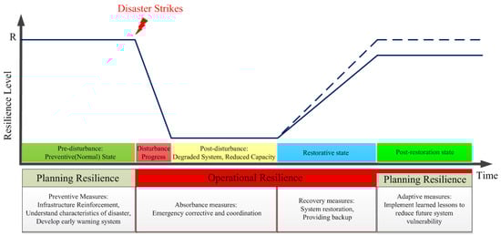 The resilience concept is introduced to examine the survivability of the power system under catastrophe and evaluate the effectiveness of countermeasures. Increasing HILP event-related power outages in recent years have driven many organizations to realize the necessity of power system resilience against such events. The US Federal Energy Regulatory Commission (FERC) [50] defines resilience as ‘the ability to withstand and reduce the magnitude and/or duration of disruptive events, which includes the capability to anticipate, absorb, adapt to, and/or rapidly recover from such an event’. Also, the C4.47 CIGRE working group add other dimensions to the resilience definition such as anticipation, preparation, absorption, the sustainment of critically operated systems, swift recovery, adaptation, and the implementation of the learned lessons from previous events [51]. The National Infrastructure Advisory Council (NIAC) [52] collects robustness, resourcefulness, rapidity, and adaptability as four attributes of a resilient system. Obviously, proper metrics and modeling approaches as key elements of this study must be correctly developed and adopted to represent the various dimensions of resilience for the quantitative assessment of power system resilience against HILP events [53]. System performance is defined as the temporal variation in a system characteristic in the context of an extreme event. It can be represented by technical metrics or various load-based indices that the operator can prioritize based on the operational strategies and objectives. Following an event, as illustrated in Figure 2, the parameter R is considered the system performance metric; thus, the system experiences states including the resilient pre-event state , event progress , the degraded post-event state , the recovery state , the post-recovery state , and infrastructure recovery . As the recovery state starts at , the system operator schedules resources and forms multiple MGs. To assess the level of network resilience, a resilience objective function is first developed considering the key characteristics underlined through standard resilience definitions.