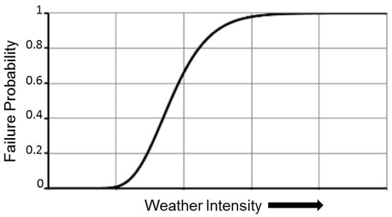 A typical fragility curve illustrating the failure probability of a component as a function of the weather intensity.