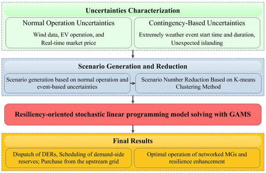 The framework of the proposed resiliency-oriented scheduling method is illustrated in Figure 4. At the beginning, previously discussed uncertainties such as stochastic processes are modeled and a set of scenarios depicting potential outcomes during the 24 h network scheduling timeframe is generated. Then, in order to make the stochastic linear programming (SLP) problem, tractable scenarios are reduced using the k-means clustering method. Finally, solving the proposed model enables the DSO to optimally schedule DERs, demand-side reserves, and power transactions with the main grid while ensuring the resiliency of the network.