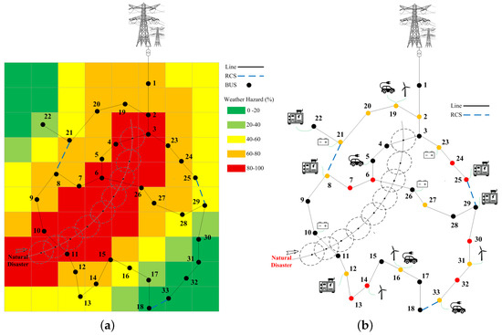 Single-line diagram of simulated distribution system. (a) HILP weather event path and network vulnerability. (b) Optimal DER placement.