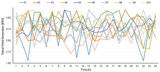 Four wind turbines (WTs) were installed optimally at buses 14, 16, 19, and 31 with a total capacity of 4 MW according to [23]. Figure 6 illustrates that the WTs’ variable power generation was a function of random wind speed. Since the distribution network had a small geographical area, the same wind speed could be applied to all WTs.
