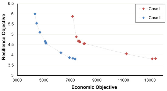 Pareto front of resilience–economic objective functions.