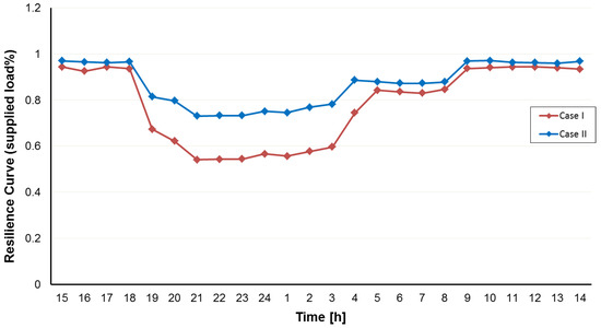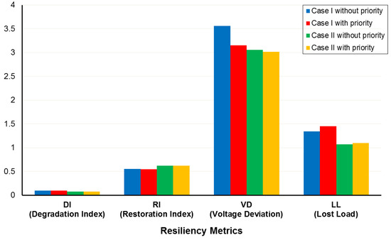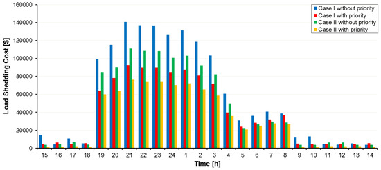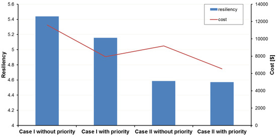 It should be noted when the distribution network is connected to the main grid, due to energy purchasing from DERs at a lower cost than from the upstream network, the operation costs reduced in case II compared to case I. The operation cost of the network without resiliency improvement is USD 5764 and USD 4376.3 for case I and case II, respectively. As depicted in Figure 15, the proposed resiliency-oriented approach optimizes cost and resiliency in all case studies and it is obvious that considering resilience objective function in the scheduling leads to a rise in operation costs. Results show that operation costs increase in case I and case II with and without considering load priority equal to USD 5832, USD 2176.4, USD 4804.7, and USD 2175.5, respectively, but the resiliency of the distribution network enhances significantly against HILP weather events, specifically those damaging overhead lines, like hurricanes.