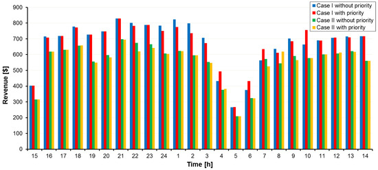 Following the extreme weather event, we assumed lines 3–4, 6–26, and 10–11 were disconnected based on the %20 vulnerability threshold; then, the network switched to islanding mode, and consequently, the limits of some lines decreased. Figure 10 and Figure 11 illustrate the incurred load-shedding cost after the event and the total revenue earned by the network operator, respectively. Slight reducing revenue in case II was the cost of network resiliency improvement that was spent to buy energy, but by the proposed resiliency improvement strategy, the load-shedding cost was notably decreased.