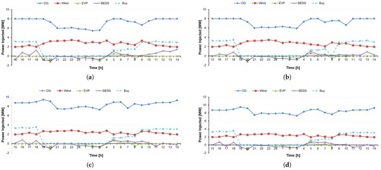 Injected power to the network in each case study: (a) Case I without priority. (b) Case I with priority. (c) Case II without priority. (d) Case II with priority.