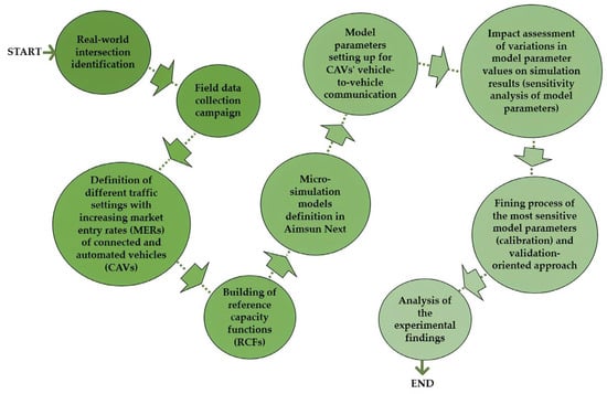 The microsimulation-driven framework proposed in this paper for analyzing the performance of CAVs alongside VHDs at various intersection designs follows the steps shown in Figure 1.