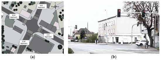 To analyze the performance of a mixed fleet of CAVs and VHDs at various intersection types and their associated traffic regulation modes, we selected a suburban, isolated four-legged signalized intersection within the road network of Opole City, Poland (50°39′17″ N; 17°57′16″ E), which was well-suited to effectively facilitate the development of diverse design proposals. The selected signalized intersection consists of a main road, “Jerzego i Ryszarda Kowalczyków”, which has two entry lanes, each 3.25 m wide, and one exit lane measuring 3.50 m in width. The main road directs traffic towards the center of Opole City in the north-west direction, while in the south-eastern direction it transitions into the DK 94 highway, which leads to the hamlet of Strzelce Opolskie. The minor road consists of “Mieszka I” street, extending in the north-easterly direction, featuring two entry lanes, each 3.25 m wide, and one exit lane measuring 3.50 m wide. In the south-westerly direction, “Jagiellonów” street includes three entry lanes that are 3.25 m wide and one exit lane that is 3.50 m wide. The signalized intersection comprises four approaches, each featuring one shared right-turn and through lane (R&T) plus an exclusive left-turn lane (L), except for the south-west (S-W) approach, which has three entry lanes for each movement. Figure 2 illustrates key details of the intersection under study, while Figure 3 shows the main results of the field data collection that took place during morning and afternoon peak hours in September 2024.