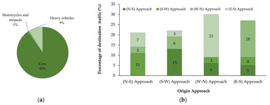 Traffic features: (a) pie graph on the vehicular composition; (b) histogram chart of origin–destination traffic by approach.