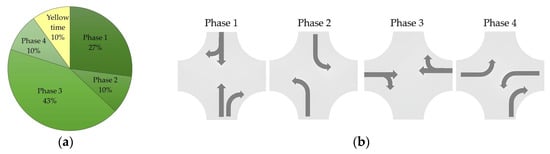 The timing plan: (a) pie graph on the green time percentage for each phase of the traffic signal; (b) the four-phase timing plan diagram with the allowable movements.