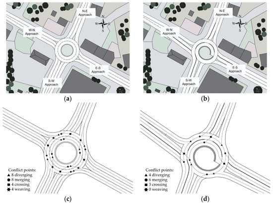 Considering the available space for a circular layout, the suburban context of the installation, and the traffic composition, an initial design for a two-lane roundabout was developed to transition the existing signalized intersection into a knee-turbo roundabout [,]. Figure 5 presents the geometric sketches of the designed two-lane roundabout (see Figure 5a) and the knee-turbo roundabout (see Figure 5b). Additionally, Figure 5c,d illustrates the conflict points for the two-lane roundabout and the knee-turbo roundabout, respectively. Changes in conflict points and vehicle path designs can aid in the comparative analysis of the roundabouts, offering better insights into how different geometric layouts influence CAV performance.