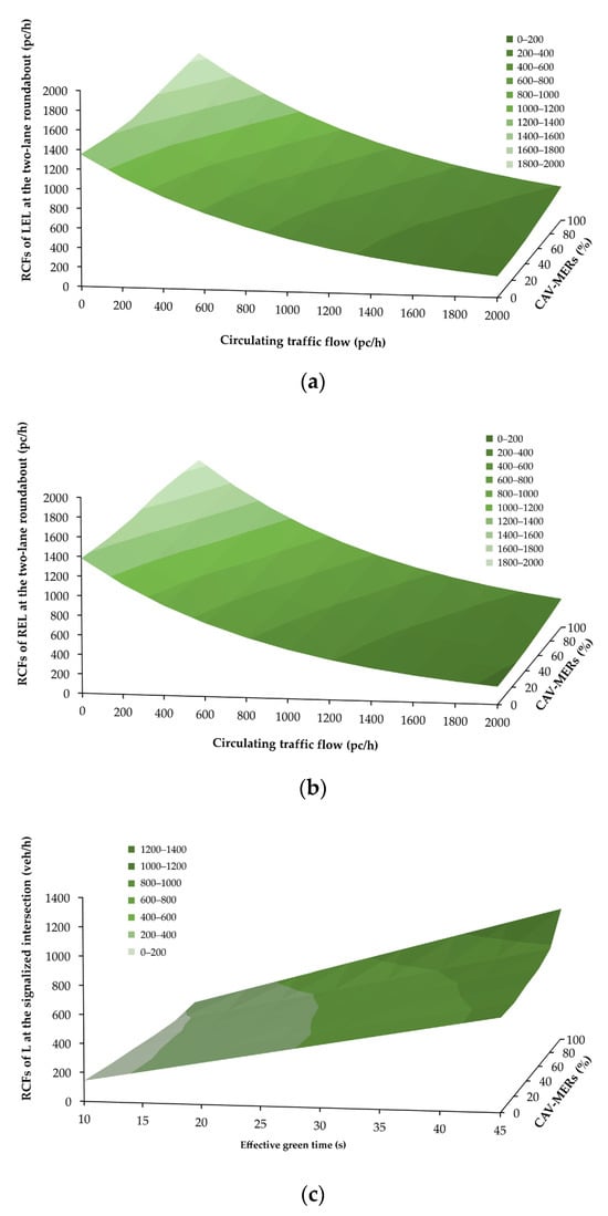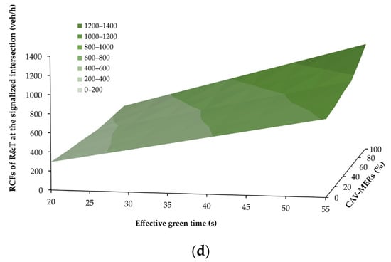 As the CAV-MERs changed, the base saturation flow rate for through movements also varied, while the saturation flow rate for left turns was adjusted with an additional correction factor based on the CAV-MERs. Modifications in CAV capacity for right turns were consistent with []. The surfaces in Figure 6 illustrate the RCFs with varying CAV-MERs at the roundabout and the signalized intersection. Specifically, Figure 6a displays the RCF of the left entry lane (LEL) at the roundabout, while Figure 6b shows the RCF of the right entry lane (REL) at the roundabout. Meanwhile, Figure 6c shows the RCF of the exclusive left-turn lane (L) at the signalized intersection as the green time increased, while Figure 6d shows the RCF of the shared right-turn and through lane (R&T) at the signalized intersection as the green time increased, highlighting how effective green time varied in response to different CAV-MERs while keeping the total cycle length constant.