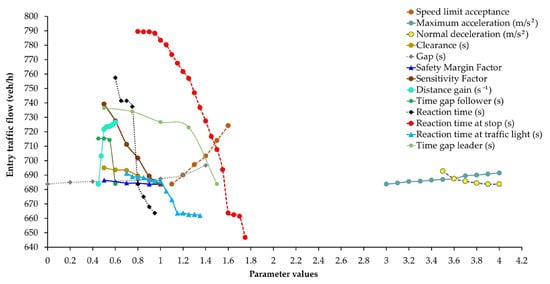 Before booting the calibration process, a sensitivity analysis was conducted to evaluate how changes in model parameters for each intersection affected the simulation results. Regardless of the intersection model considered, the sensitivity analysis primarily involved global parameters affecting all vehicles in the network and specific vehicle class parameters targeting distinct road user categories. Figure 7 summarizes the sensitivity analysis results for the case study, illustrating the variation of entering traffic within the range of the most sensitive parameter values.