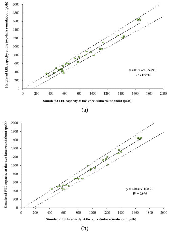 The scatter plots in Figure 8 drive the validation of the analogy in entry mechanisms for the roundabout and knee-turbo roundabout (W-N approach). By way of example, Figure 8a displays capacity data for the LEL, and Figure 8b shows the REL with 40% CAVs and 60% VHDs. The narrow prediction intervals and high R2 values observed across the different cases indicated a strong positive correlation between the datasets for both roundabout types, thereby supporting the extension of the two-lane roundabout calibration to the knee-turbo roundabout model.