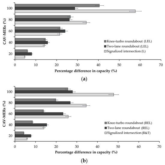 Focusing on the W-N approach in Figure 2 and Figure 5, Figure 9 compares the knee-turbo roundabout, two-lane roundabout, and signalized intersection regarding the percentage differences in entry capacity by entry lane or lane group (i.e., LEL and L capacities in Figure 9a and REL and R&T capacities in Figure 9b) between the baseline setting with 0% CAVs and traffic settings with progressively increasing CAV-MERs.