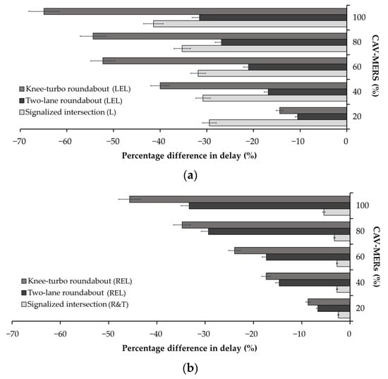 Comparison among the knee-turbo roundabout, two-lane roundabout, and signalized intersection in terms of percentage differences in delay (s) across various CAV-MERs for (a) the left-entry lanes (LELs) of the two-lane and knee-turbo roundabouts and the exclusive left-turn lane (L) of the signalized intersection; (b) the right-entry lanes (RELs) of the two-lane and knee-turbo roundabouts and the shared right-turn and through lane (R&T) of the signalized intersection.