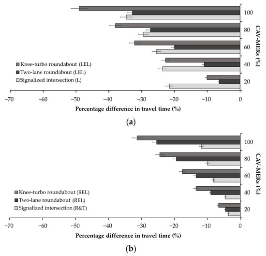 Comparison among the knee-turbo roundabout, two-lane roundabout, and signalized intersection in terms of percentage differences in travel times (s) across various CAV-MERs for (a) the left-entry lanes (LELs) of the two-lane and knee-turbo roundabouts and the exclusive left-turn lane (L) of the signalized intersection; (b) the right-entry lanes (RELs) of the two-lane and knee-turbo roundabouts and the shared right-turn and through lane (R&T) of the signalized intersection. Note: the acronyms are provided in the legend.