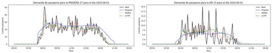 Short-term passenger demand forecasting is a critical input for dynamic bus dispatching, enabling anticipatory decision-making in systems subject to spatiotemporal variability. This subsection presents the methodological formulation and comparative evaluation of three time series forecasting models: Autoregressive Integrated Moving Average (ARIMA), Long Short-Term Memory Networks (LSTM), and Prophet. Each model is designed to predict the expected passenger count per route–direction–time triplet , given the historical observation filtration .
