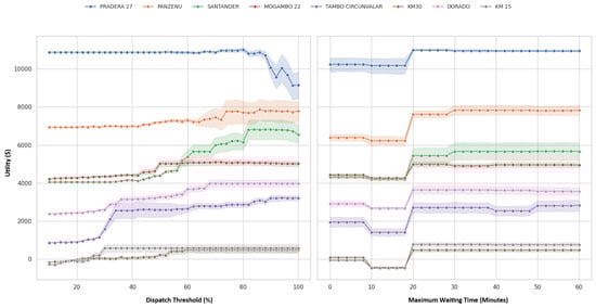 Overall, it is observed that the heuristic generates lower operational utilities compared to those obtained by the optimization model. This is particularly evident in the Tambo Circunvalar, KM 15, and Mogambo 22 routes, where the gaps are 11.84%, 7.07%, and 8.05%, respectively. On the other hand, routes such as Pradera 27, KM 30, and Panzenu show smaller differences between the utilities obtained by the heuristic and the model, with gaps of 4.91%, 4.79%, and 1.56%, respectively. This superior performance of the MILP model compared to the heuristic is attributed to its ability to explore dispatch alternatives more thoroughly. The model achieves a better balance between service level, vehicle capacity utilization on each trip, and operational efficiency, allowing it to identify solutions with more favorable cost–benefit relationships for system operation. By contrast, the fixed-interval baseline dispatch rule produces utility gaps above 31% on every route—66.78% on Pradera 27, 60.47% on Panzenu, 60.34% on Santander, 31.10% on Mogambo 22, 41.42% on Tambo Circunvalar, 116.05% on KM 30, 39.70% on Dorado, and 61.23% on KM 15—demonstrating an overall far poorer performance.