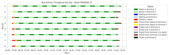 An example of the dispatch schedule established by the heuristic is presented in Figure 4, which illustrates the specific scheduling for the Pradera 27 route. The figure shows how buses begin operations in the stored in depot state (red), from where some of them proceed to travel either from the depot to terminal 1 (orange) or terminal 2 (yellow) to arrive at the terminals in time to start their respective trips in direction 1 (dark green) and direction 2 (light green). This ensures that passenger demand is met from the start of operations, scheduled for 5:00 a.m.