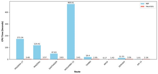 Figure 5 presents the computational execution times of both the heuristic model and MILP model. As expected, the results show that the computational times for the optimization model are significantly higher than those for the heuristic approach. Specifically, routes such as Pradera 27, Panzenu, and Mogambo 22 require 173.34, 119.41, and 469.61 s, respectively, to find a solution, making them the most computationally demanding. However, for routes like KM30 and KM15, which have lower demand and fewer available buses, the optimization model finds solutions considerably faster, even recording execution times lower than those of the heuristic.