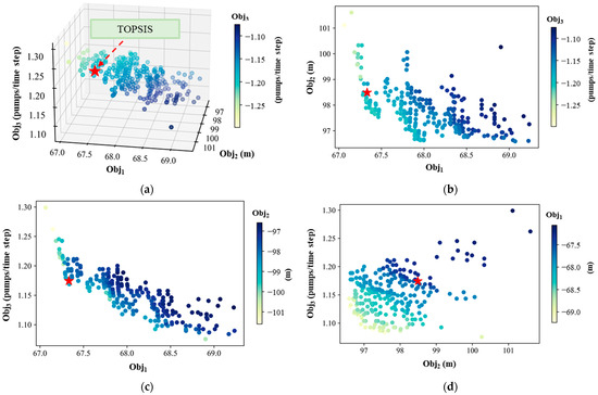 Pareto front of 255 converged solutions obtained from NSGA-III. (a) Pareto front. (b) Obj1 vs. Obj2. (c) Obj1 vs. Obj3. (d) Obj2 vs. Obj3. The asterisk shown in (b,d) denotes the optimal solutions selected by the TOPSIS. Obj1 optimizes flood hazards. Obj2 stabilizes internal (forebay) water levels. Obj3 reduces pump switching frequency.