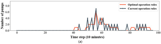 This objective limits frequent activation of the pump to decrease its energy consumption, maintenance costs, and wear while maintaining effective flood control. The average number of pump activation cycles is calculated per event to assess the operation performance. Lowering the number of active pumps while effectively controlling the internal water level would reduce the energy consumption and power costs. Smart operational rules minimize on–off cycling and operate the pumps during off-peak hours when possible. The calculation formula is shown in Equation (5).
