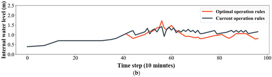 This objective minimizes the sum of hazards, which is evaluated using Zhongshan #8’s sewer water levels and internal water levels. The rules keep the water levels well below critical water levels during storms to reduce flood hazards. They reduce flood hazards by minimizing the maximum internal water level during events, ensuring a sufficient capacity for the inflow of sewer water, which directly impacts flood prevention. The calculation formulas are shown in Equations (1)–(3).