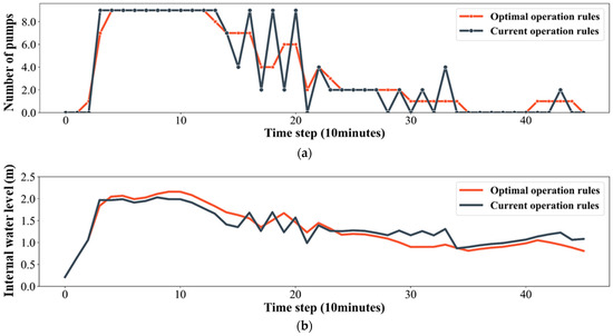 It is noted that NSGA-III was employed to optimize the pumping station’s operational strategies using historical flood event data. Specifically, the dataset was divided into 24 training events (comprising 2120 data points) and 14 testing events (comprising 659 data points), based on historical inflow and operational records. The training data were used to simulate the system’s responses under various operational strategies, incorporating the initial water levels, inflow conditions, and pump operation records to evaluate objective functions and refine the optimization process. Regarding the stationarity of the data, we recognize that urban hydrological systems are inherently subject to long-term non-stationary influences such as land use changes and climate variability. However, for the purposes of this study, we assumed relative short-term stationarity in both the hydrological and infrastructural conditions over the selected study period. This assumption is supported by the observed consistency in the rainfall patterns, inflow characteristics, and operational settings across the selected events.