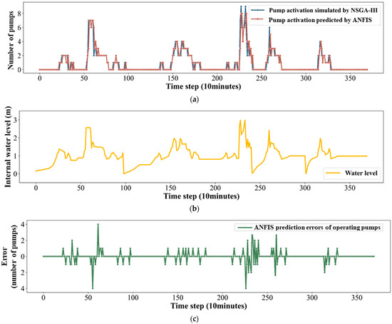 Compared to the simulated results of the TOPSIS-selected optimized operational rules obtained from NSGA-III, the ANFIS model exhibited a strong predictive performance, achieving an overall R2 of 0.81 between the predicted and simulated pump activation counts. Most of the prediction errors fell within one pump, indicating reliable tracking of operational trends.