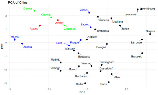 The results of the PCA allowed us to draw initial conclusions about similarities among the cities (see Figure 1). It is easy to see that Almaty and Astana (marked red) are close to each other, i.e., one’s experience may be suitable for the other in the future. Based on global patterns, the closest ones are Ottawa, Zaragoza, and Denver (marked green). One can also discuss Phoenix and Ankara as similar to Astana, and Sofia, Prague, Zagreb, and Vilnius as similar to Almaty (marked blue). They form a “second tier” of similarities.