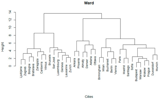 The next method was agglomerative cluster analysis. It is widely used in social and economic research and allows to combine objects (cities) into groups based on similarity in terms of some indicators [108]. Agglomerative clustering represents a hierarchical approach to clustering, wherein data points exhibiting similarity are successively grouped. The procedure initiates with each data point constituting an individual cluster. Subsequently, clusters are iteratively merged according to a similarity measure until a single cluster encompasses all points. This approach relies on a proximity measure that quantifies the similarity or dissimilarity between clusters. The similarity can be determined using various distance metrics, including Euclidean distance or the correlation coefficient. Ward introduced a merging criterion in 1963 [109], which remains widely applied in agglomerative clustering. His method aims to minimize the within-cluster variance by merging the pair of clusters that yield the smallest increase in the sum of squared deviations from the mean of the newly formed cluster.