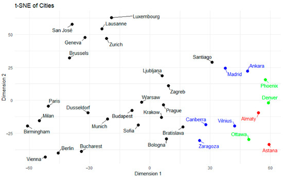 Thus, two of the three approaches converge in terms of their results to a certain extent. The remaining method—t-SNE—was used to identify possible similarities of a nonlinear nature among cities, which would allow us to select additional data points for analysis. Also, if it turned out that the previously selected cities were very different, then it would be necessary to reconsider our approach to the analysis.