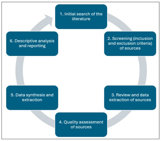 This study adopts a systematic review of the literature based on the guidelines from Kitchenham [26] and the recommendations from Webster and Watson [27], as shown in Figure 1. In the first phase, “the initial search of the literature,” online databases and search engines were used for searching the literature. The online databases and search engines comprise Google Scholar, Scopus, and Web of Science databases. To carry out the search, several keywords were used, including “self-sovereignty” OR “digital sovereignty” OR “data sovereignty” AND “smart mobility” OR “intelligent mobility” AND “local communities.” Because digital sovereignty is an emerging topic, the search period was restricted to research published between 2000 and 2025. The inclusion and exclusion criteria were formulated to efficiently select relevant sources that are aligned to the study area of how digital sovereignty can improve smarter mobility solutions in local communities. In this study, the inclusion criteria were restricted to studies that are more aligned with the research questions being explored, as presented in the introduction section of this paper. The exclusion criteria help remove studies that are not aligned to the study area.