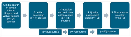 Figure 2 shows the literature selection process employed to select sources related to the study area of digital sovereignty. Based on the initial searched sources (as shown in Figure 2), 124 potential sources were retrieved from the searched online databases using the keywords previously stated. After initial screening, 4 sources were removed as duplicates, and the 120 sources were then checked against the inclusion and exclusion criteria (as previously stated). Then, 48 sources were excluded as they did not meet the inclusion criteria. This resulted in 72 sources, which were checked for quality assessment. For the quality assessment, this study evaluated each of the sources included by checking the methodological contribution of each source, highlighting if the source is highly relevant to the study area and if there is a clear methodology or approach that was employed in the study to address the aim and research objectives.