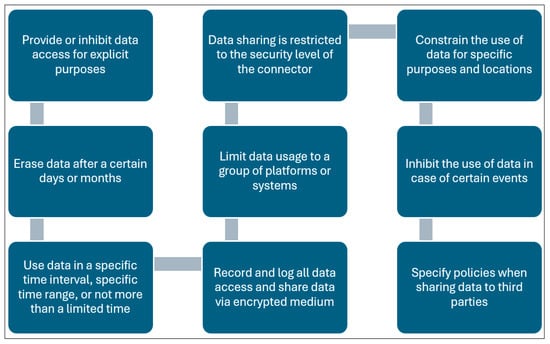 Similarly, sophisticated access control techniques, such as the Open Digital Rights Language employed by the IDSA or the eXtensible Access Control Markup Language (XACML), can be adopted [48]. After data access has been authorized, the next concern related to sovereignty is what happens to the data. Thus, usage control relates to the specification and enforcement of constraints regulating the lifecycle of the data that are shared. Usage control policies assert constraints on how data can be consumed after they have been shared [47]. Usage control is managed with requirements that apply to data processing (responsibilities), such as those related to compliance with regulations, intellectual property protection, and digital rights management. It also involves data provenance (data traceability and tracking) to ascertain the origin or lineage of the shared data [25]. Based on the literature [4,22,25,47], Figure 5 depicts data usage control and access strategies in data spaces.