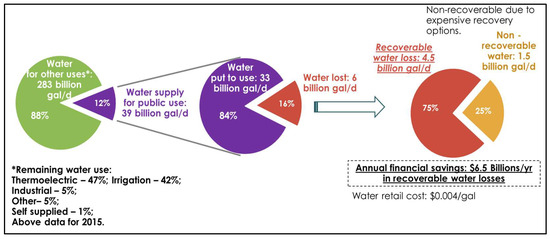 The United States (US) water infrastructure distributes approximately 71 billion gallons per day (BGD) of drinking water and wastewater through an extensive network of drinking water, wastewater and stormwater systems [1]. The US water infrastructure is aging and deteriorating. With the increasing emphasis on the need for a “replacement era”, the systems put in place in the early 19th and 20th century will be entering a phase of repairs and replacement of existing pipelines by 2030 [2]. The water lost between the treatment plant and the end-point customer is called non-revenue water (NRW). Nearly 16% of the treated drinking water supplies is currently lost due to ~250,000–300,000 water main breaks per year, with losses in the order of ~USD 7.6 billion [1,3]. Water losses in the systems are typically due to leakage on transmission and distribution mains, utility’s storage tanks and leakage on service connections as per the classification of American water works association [4]. US EPA estimates the need to spend USD 97 billion for water loss control in the form of time and financial resources by the water systems [1]. Water leaks are not a minor “engineering” nuisance; they are a compound urban risk that wastes scarce water, drains utility budgets, inflates energy and carbon footprints, threatens public health, and weakens the overall resilience of cities. Because the impacts propagate well beyond the water sector—into climate, health, transport and local economies—reducing Non-Revenue Water (NRW) is one of the highest-return investments most cities can make in their infrastructure portfolios [5].