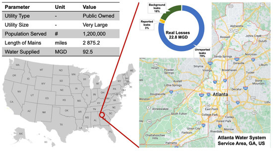 A water leakage case study has been presented for Atlanta Water System, a very large public water utility serving a population of ~1.2 million in the Fulton County, Georgia (GA), US (Figure 3). This utility was chosen because of having one of the highest real water losses in the state accounting for ~8350 MG of water lost in 2020. Publicly available information from the utility’s 2020 water audit report [15] was used to obtain information water quantity balance sheets (imports, exports, metered, billed, consumption, apparent and real water losses); pipeline mains and service connections; and operational costs of the water distribution system.