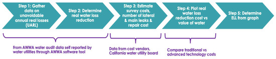Figure 4 describes the new methodology to estimate the economic level of leakage to compare the costs of two technology options for mitigating water leaks—the conventional pipe leak detection method (acoustic leak detection) against the advanced leak detection method (satellite leak detection). In addition, the developed cost assessment methodology estimates the water loss reduction, infrastructure leakage index (ILI) and optimum number of surveys needed to reduce the real water loss reduction in water distribution and supply systems. The proposed methodology performs the economic analysis only based on the service connections and mains pipelines in the water distribution network and excludes other water leakage sources such as water hydrants and household plumbing leaks. Because the proposed methodology calculates cost based on literature and different vendor estimates for the assumed two technology types—acoustic and satellite leak detection, the methodology used is translatable to any water system and therefore easily reproducible. Section 2.2.1, Section 2.2.2 and Section 2.2.3 detail the stepwise model calculations as shown in Figure 4.