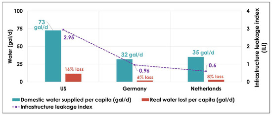 Per capita water supplied, real water loss (gal/d), and ILI in domestic use for the United States, Germany, and The Netherlands in 2015 [24,25,26,27,28].