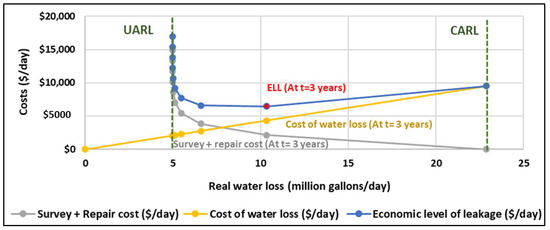 Estimation of economic level of leakage for advanced satellite leak (ELL) detection technology (UARL—Unavoidable annual real loss; CARL—current annual real loss).