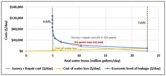 The main objective of the present analysis was to estimate the ELL for the acoustic leak detection technique and the novel satellite leak detection technique. Given a leak detection technique, the ELL point aids in the analysis of economic feasibility through the estimation of leak detection technique expenses and compares them against the economic benefits of water being saved by the implementation of the leak detection technique. The ELL is a point at which the sum of the costs of leak detection, repairs, and water loss is at its minimum value as indicated by the following formula [12]: