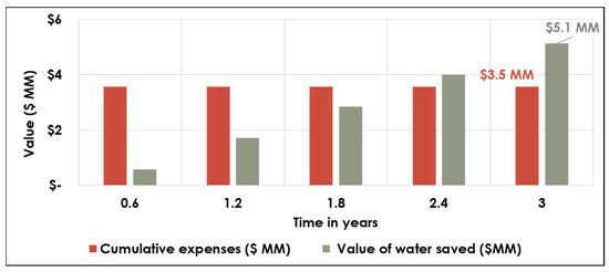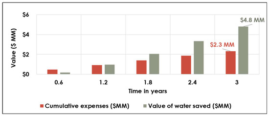 Annual cumulative expenses and value of water saved were also estimated for both the technology types to capture the economic impact of survey time. As stated earlier, one of the major advantages of satellite leak detection was its faster leak detection time, which was 80% lower than that of acoustic leak detection. As a result, the economic benefits of conserving water were realized more promptly. Concurrently, all the expenses associated with satellite leak detection were incurred until 0.6 years as the survey was completed within that time frame. No expenses occurred beyond that time until 3 years as shown in Figure 8. However, as shown in Figure 9, for the conventional acoustic leak detection survey technology, the survey and leak repair expenses were gradually incurred until 3 years, at which point one entire survey was completed.